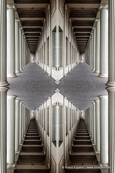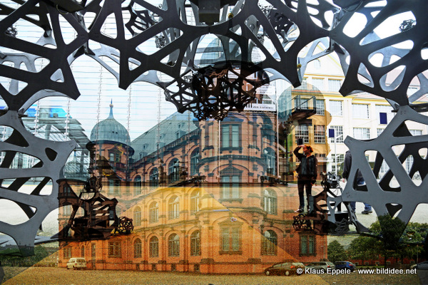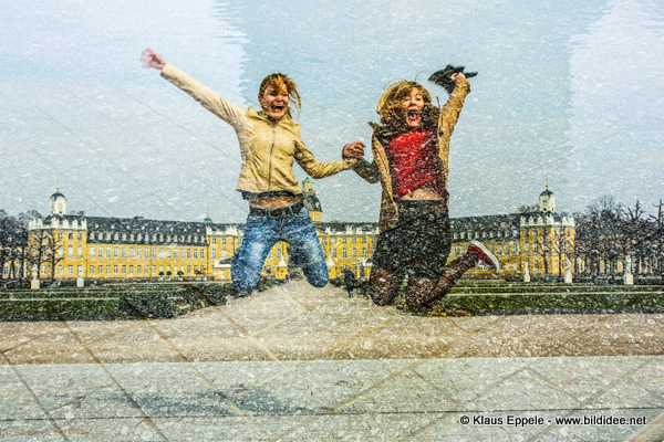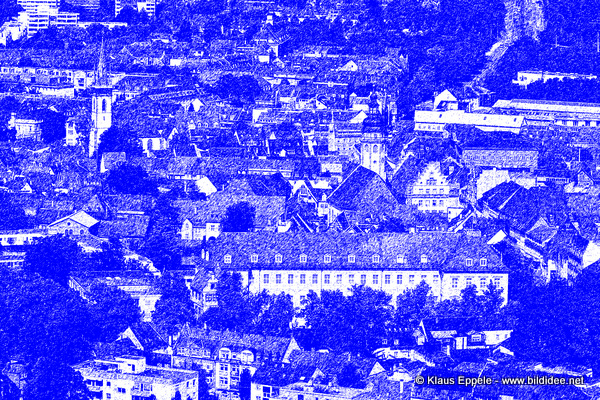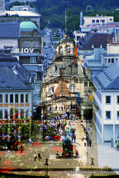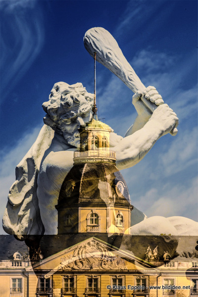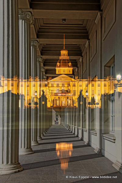 Blick auf den Schloßturm und von diesem zurück auf die Innenstadt Karlsruhes |
