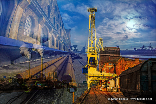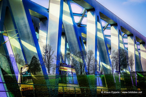 Eisenbahnbrücke über den Rhein und Blick von dort auf das Hofgut Maxau |