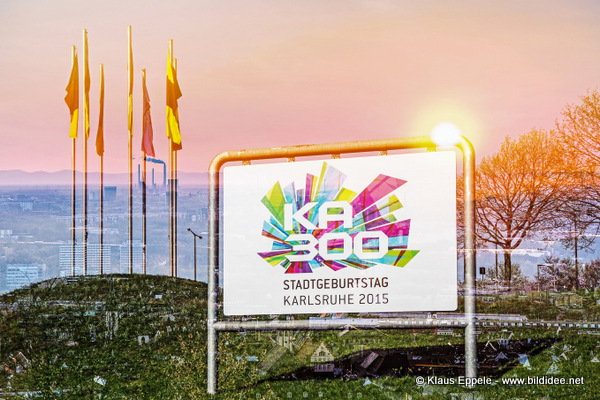 Überdimensionales Ortsschild und Blick vom Turmberg auf Karlsruhe |