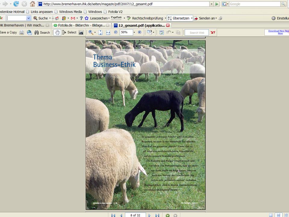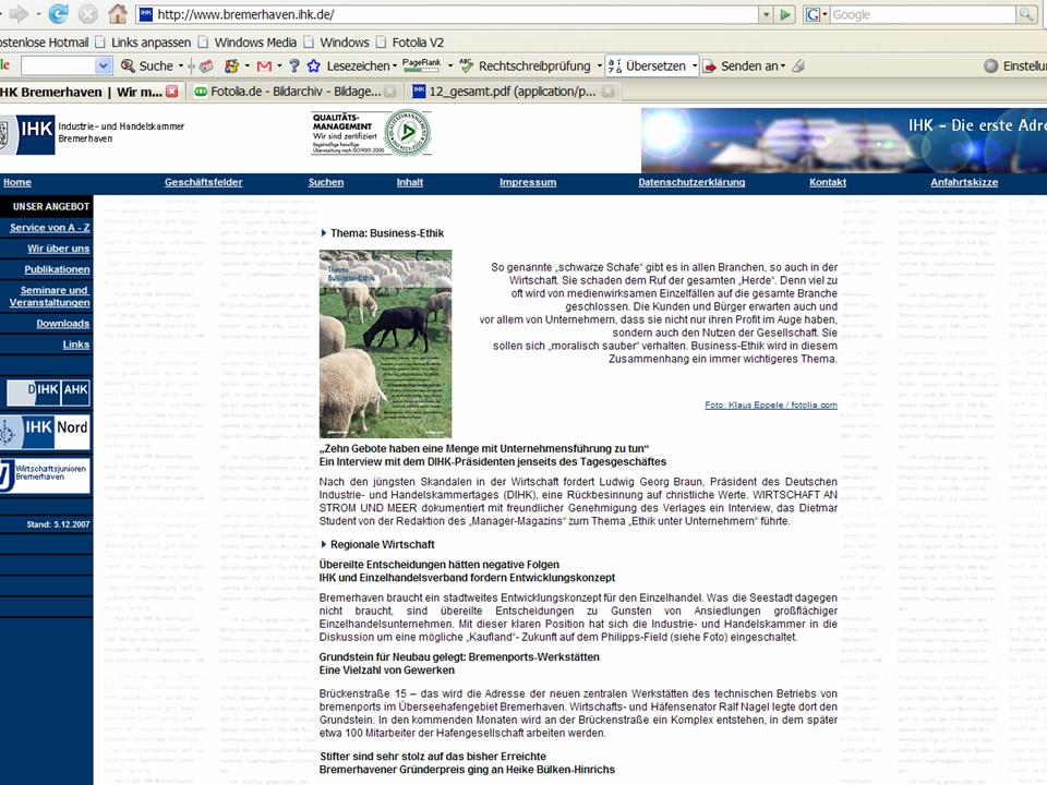 veröffentlichte mein Foto “Schwarzes Schaf” in ihrem Magazin “Wirtschaft an Strom und Meer”, 12/2007, Seite 8 und im Internet unter www.bremerhaven.ihk.de.  |