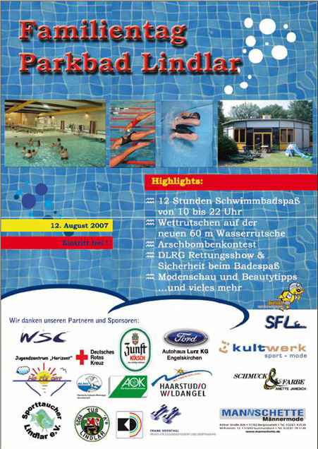 Foto ”Schräglage” ziert Flyer und Plakate für einen Familientag im Parkbad Lindlar, die von STRATEGIE X designed wurden.  |