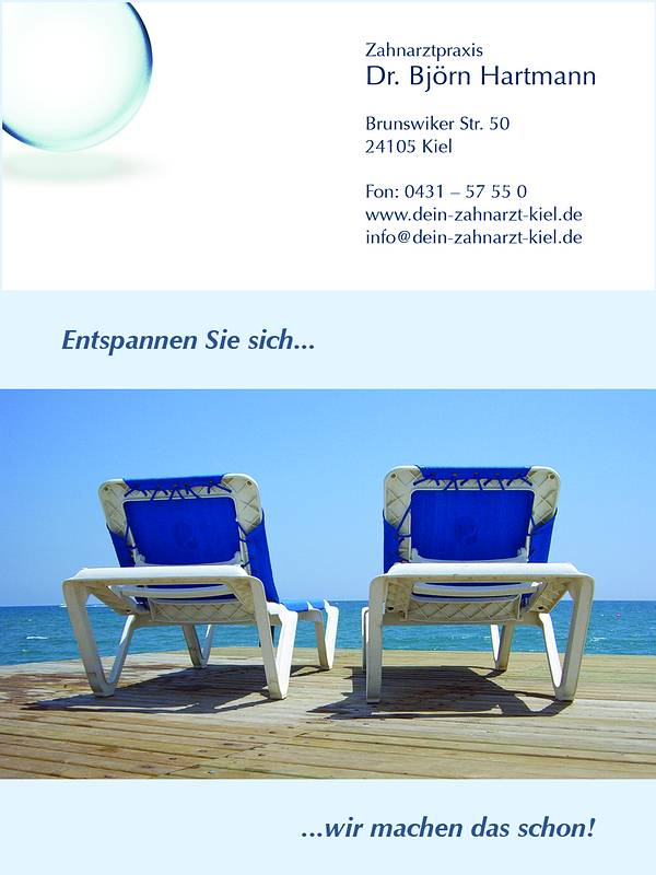 verwendete mein Foto “Relaxen” für eine Imageanzeige der Zahnarztpraxis Dr. Björn Hartmann, die im Kieler Stadtmagazin Kielside erschien.  |