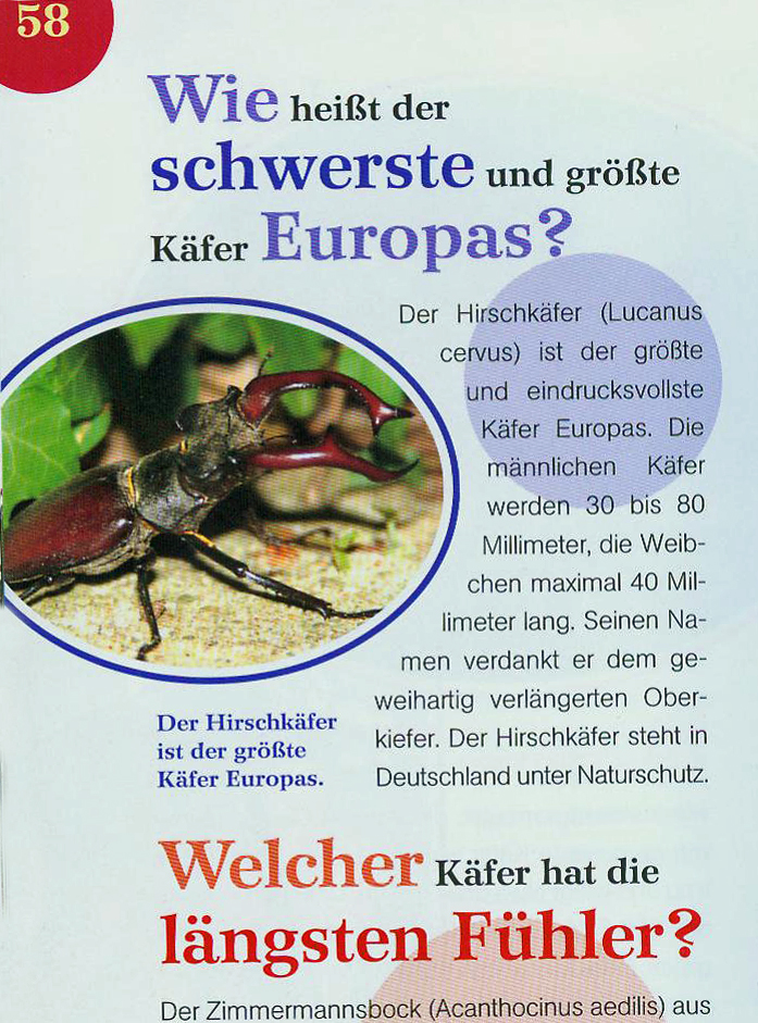Der Compact Verlag, München, druckte mein Foto “Hirschkäfer” im Kinderbuch "Rekorde aus dem Reich der Tiere", ISBN