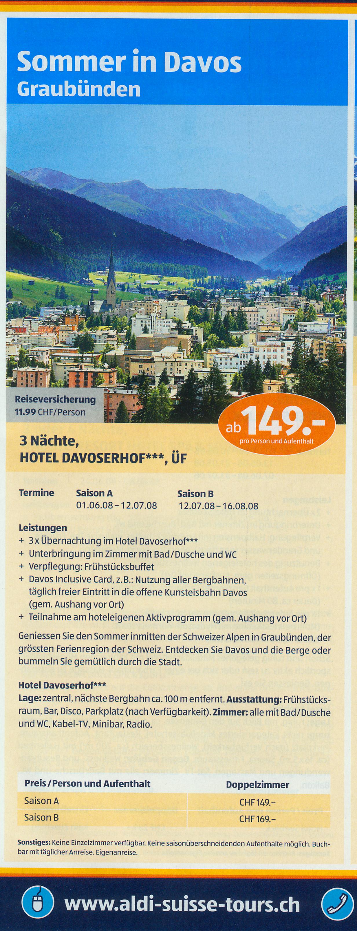 Die HESSKISS Werbeagentur AG aus Zürich brachte mein Foto “Davos Platz” in den Prospekt ALDIREISEN April 2008.  |