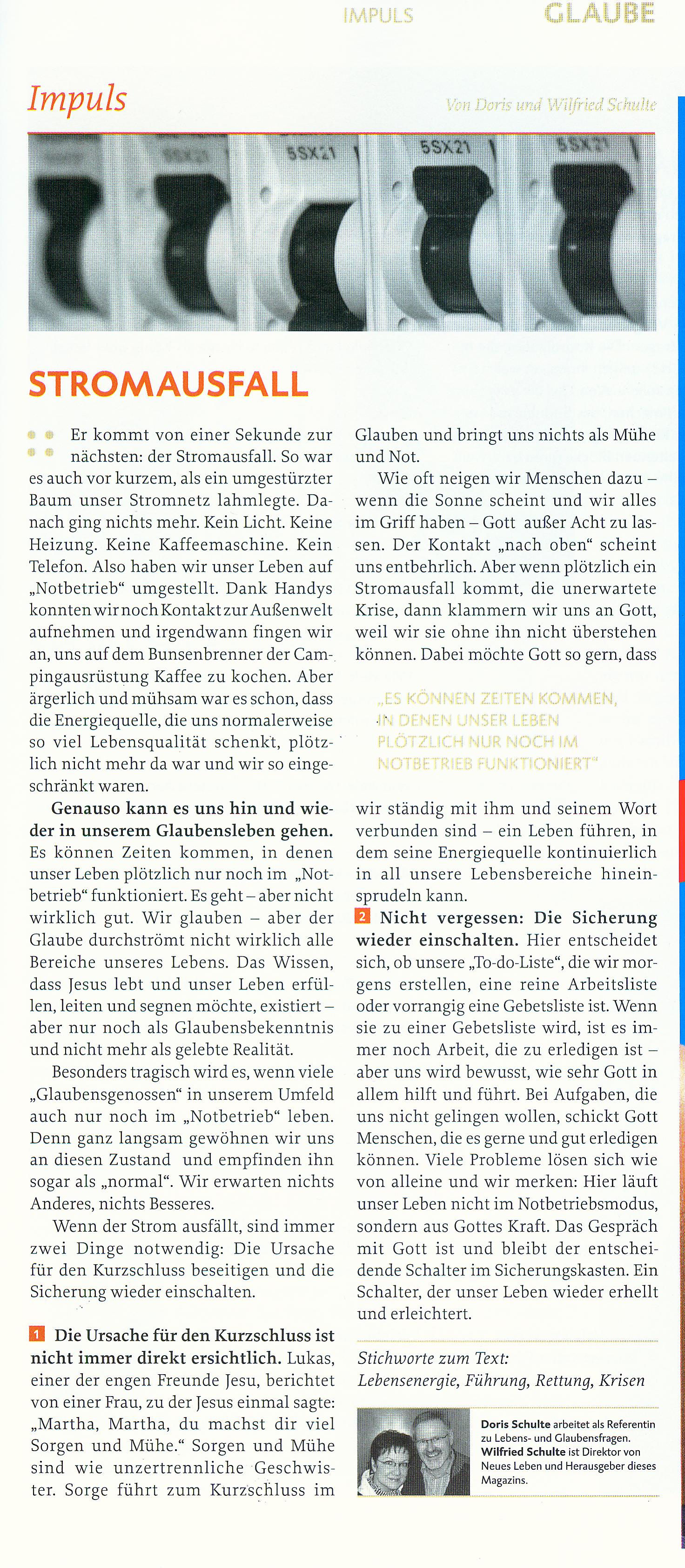 Mein Foto “Stromunterbrechung” erschien in der Mai-Ausgabe des Magazins “Neues Leben”.  |