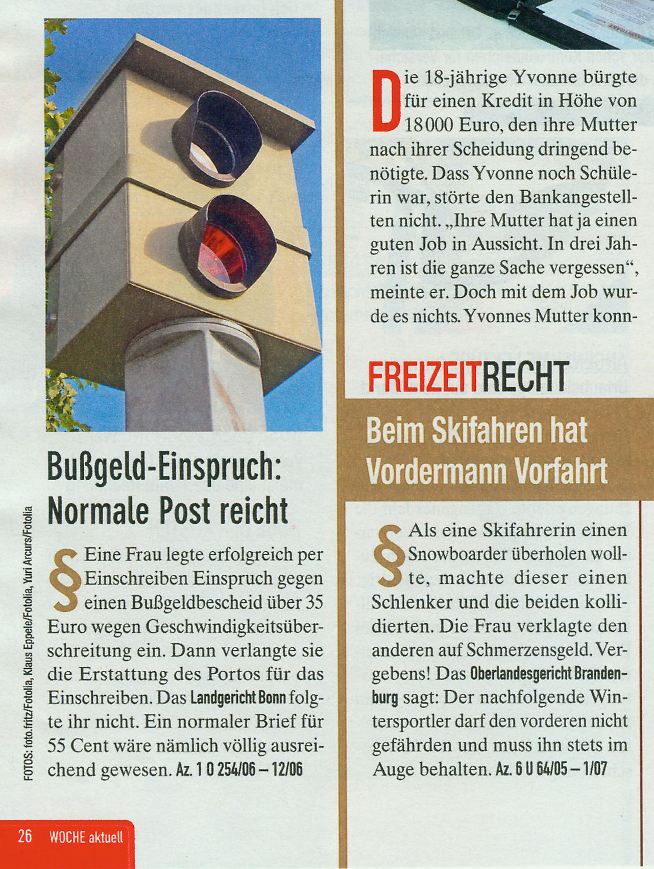 Der Klambt-Verlag aus Baden-Baden druckte mein Foto “Radarfalle” in der Zeitschrift “WOCHE aktuell", Ausgabe 6, Seite 26.  |