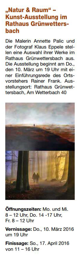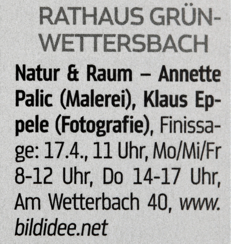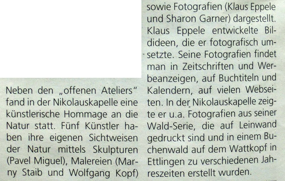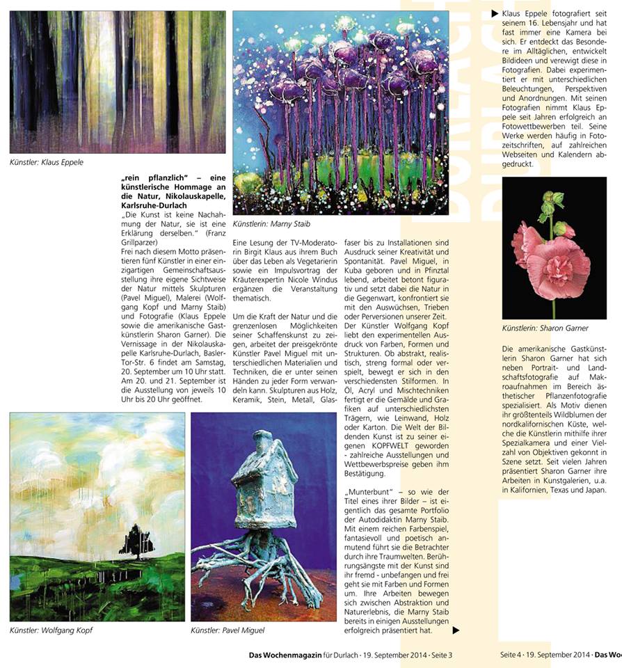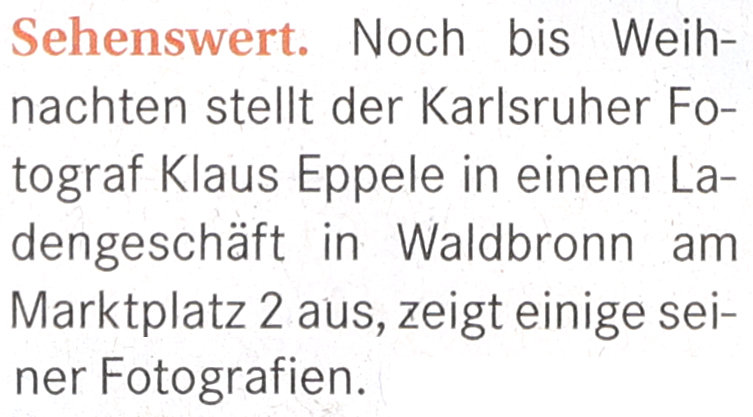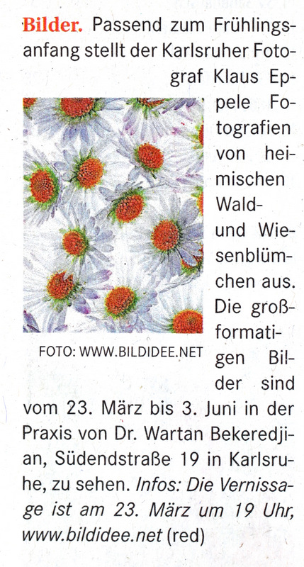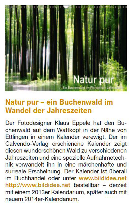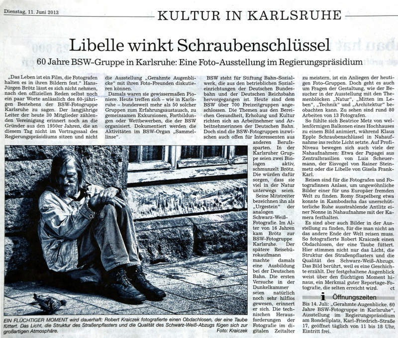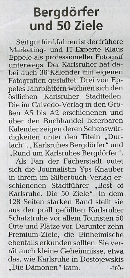 im Juni 2013MSP im Mai 2013BNN vom 15. März 2013Inka Nr. 85MSP im März 2013Rheinpfalz am 16. Januar 2013Boulevard Baden am 14. Januar 2013Digitalphoto 11/2012Sammellinse 2/2012metropolnews im Mai 2012chirprax.de im Mai 20012metropolnews im April 2012Monatsspiegel Rüppurr, Februar 2012Inventa/RendezVino - Das Magazin im Februar 2012www.rendezvino.info im Januar 2012 www.karlsruhe-entdecken.de im Januar 2012