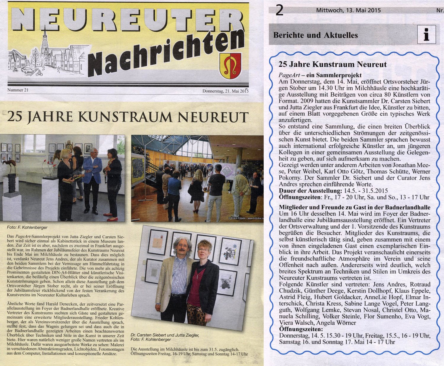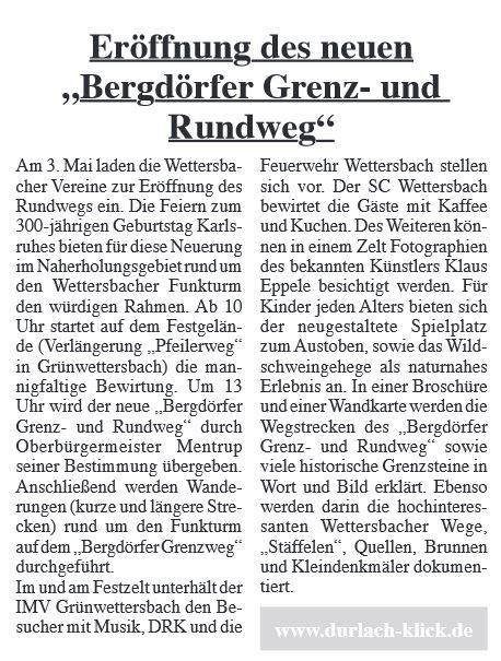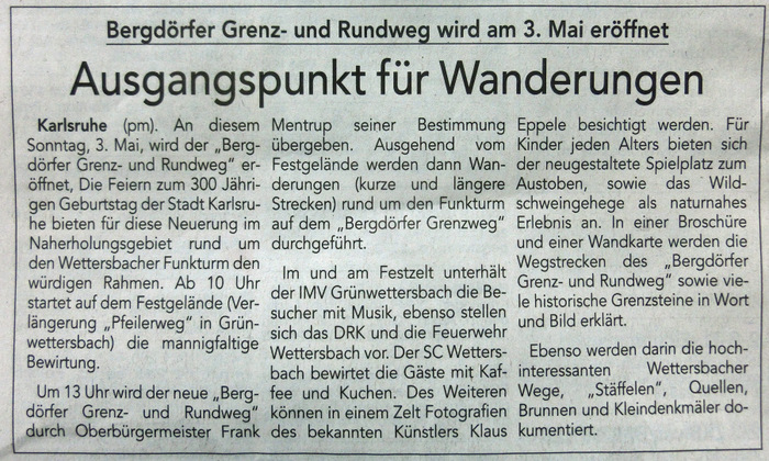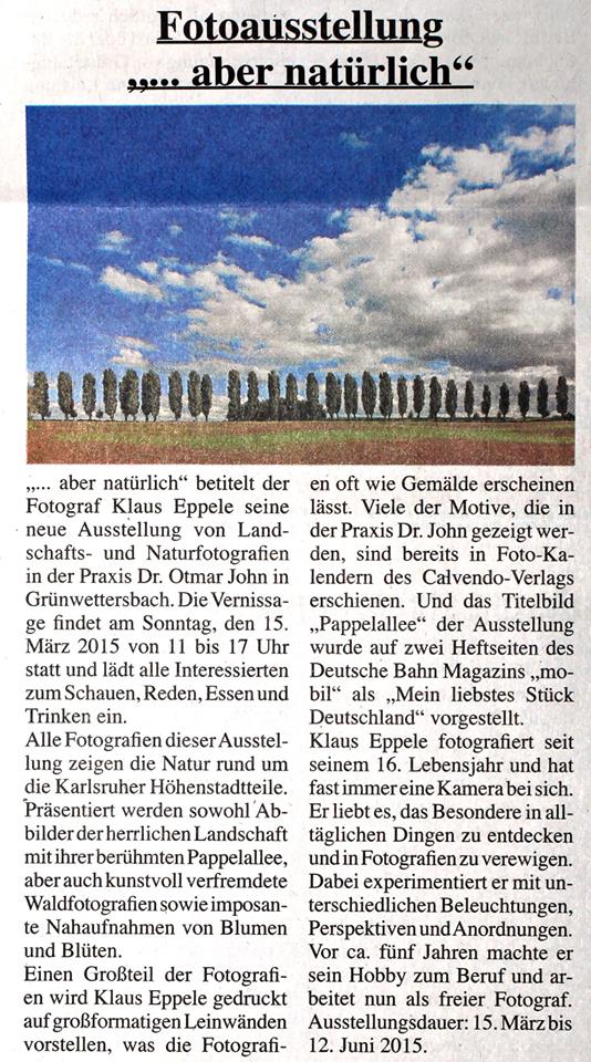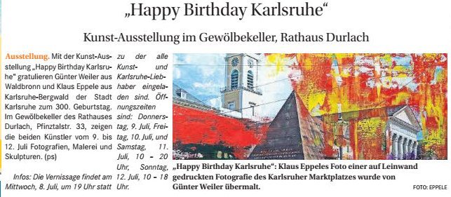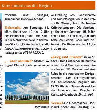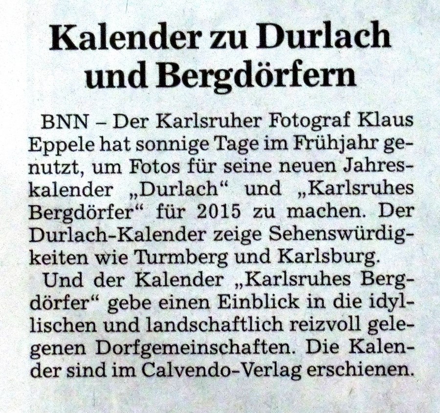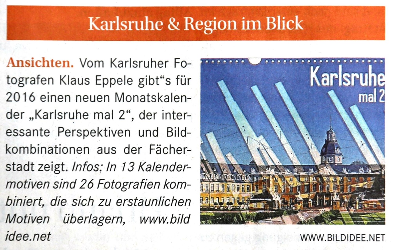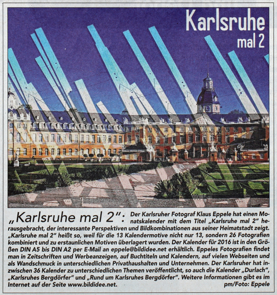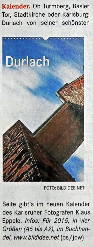 karlsruhe-entdecken im Juni 2015durlacher.de im Juni 2015karlsruhe-entdecken im Juni 2015Wochenblatt am 13. Mai 2015Neureuter Nachrichten im Mai 2015Badische Neueste Nachrichten am 02. Mai 2015Der Kurier am 30. Mai 2015Durlach-Klick im April 2015Mitteilungsblatt Hohenwettersbach am 19. März 2015Wochenblatt am 11. März 2015Durlacher Blatt am 5. März 2015