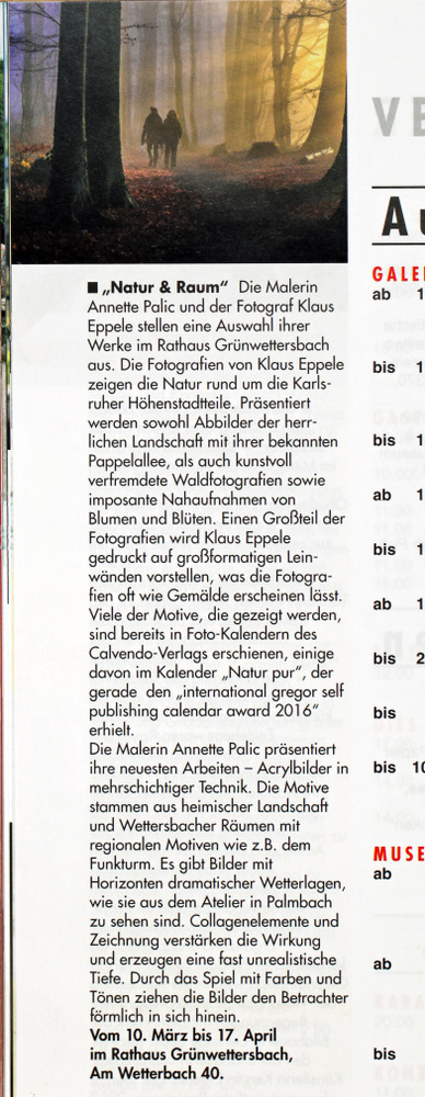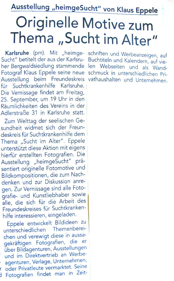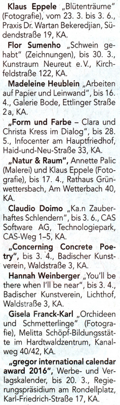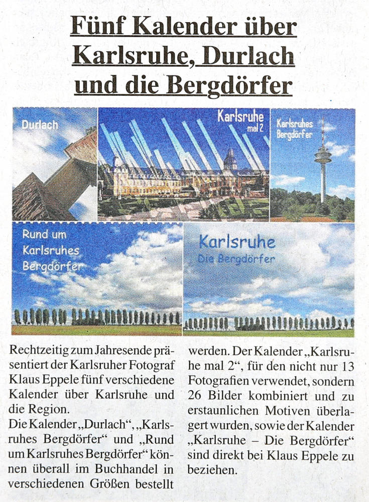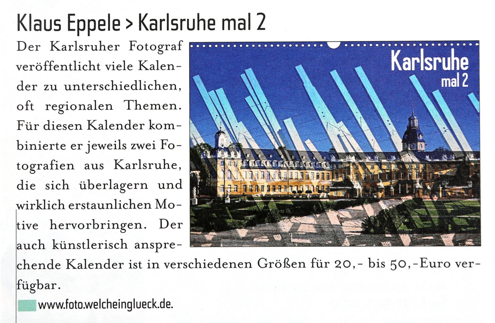 im Januar 2011Veranstaltungskalender Karlsruhe im Januar 2011www.karlsruhe-endecken.de im Januar 2011Diverse Veranstaltungskalender WiDu 17 vom Dezember 2010Treffpunkt, Dezember 2010DVF-Journal 1-2/2011Der Kurier vom 10.12.2010Monatsspiegel, Dezember 2010www.dvf-fotografie.de im November 2010